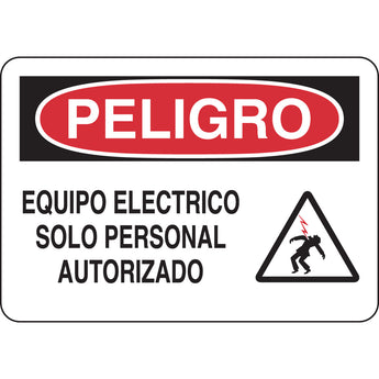 Señal bilingüe de 7 x 10" Leyenda: PELIGRO, EQUIPO ELECTRICO, SOLO PERSONAL AUTORIZADO
